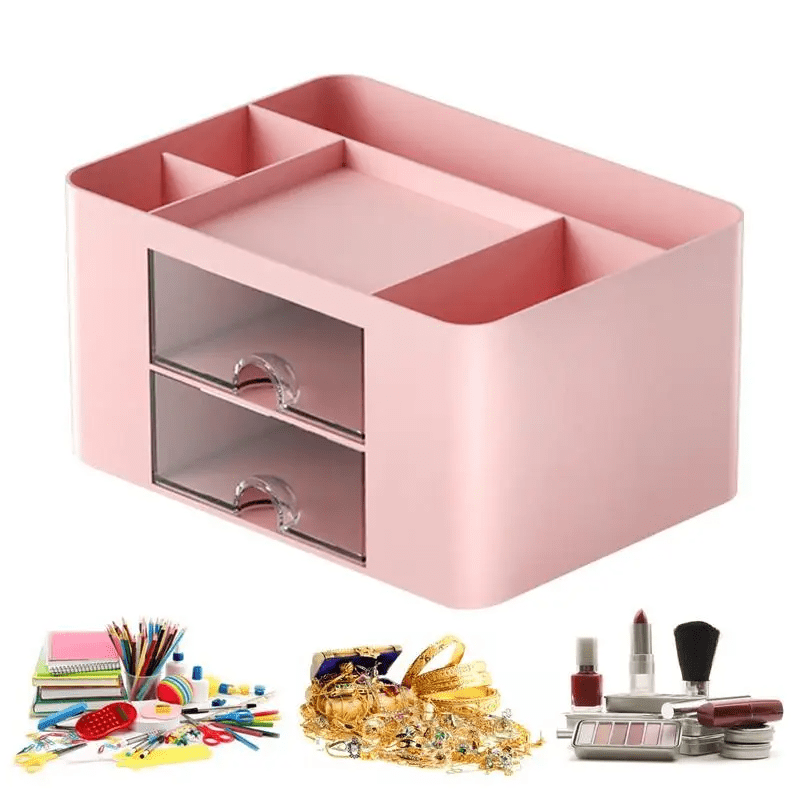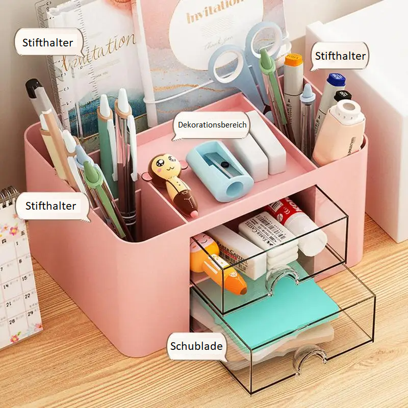 Design auf zwei Ebenen: Unser Schreibtisch-Organizer verfügt über ein cleveres Doppeldeck-Design und bietet ausreichend Platz zum Aufbewahren und Organisieren einer Vielzahl von Gegenständen. Das Oberdeck eignet sich perfekt für kleinere Büroaccessoires und Kosmetikartikel, während das Unterdeck über geräumige Schubladen zum sicheren Verstauen von Stiften, Schreibwaren und anderen wichtigen Dingen verfügt.
