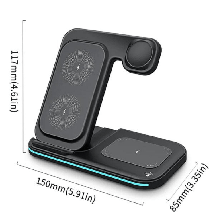 Dank des intelligenten und innovativen Designs können Sie Ihr Smartphone, Ihre Kopfhörer und Ihre Smartwatch gleichzeitig aufladen und so Zeit und Energie sparen. Egal, ob Sie zu Hause, im Büro oder unterwegs sind, unser 3-in-1-Ladegerät ist der perfekte Begleiter, um alle Ihre Geräte immer voll aufgeladen und einsatzbereit zu halten.
