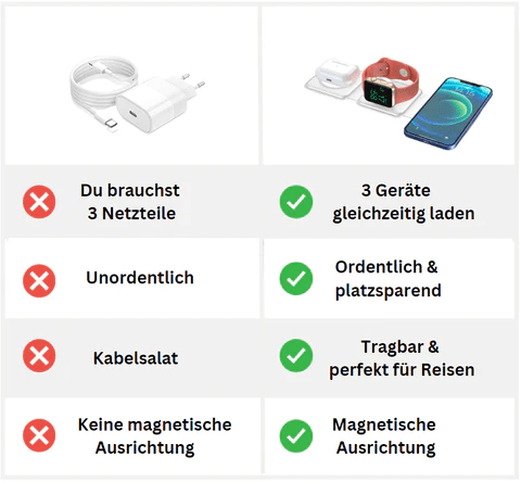 Unsere UltiMag™ Ladestation ist unglaublich praktisch und mobil. Sie lässt sich auf nur 2,5 cm zusammenfalten, sodass sie problemlos in deine Tasche, Handtasche, deinen Rucksack oder sogar in deine Jackentasche passt. Somit brauchst du nie wieder mehrere Ladekabel mitzuführen, wenn du unterwegs bist und auf die Reise gehst!